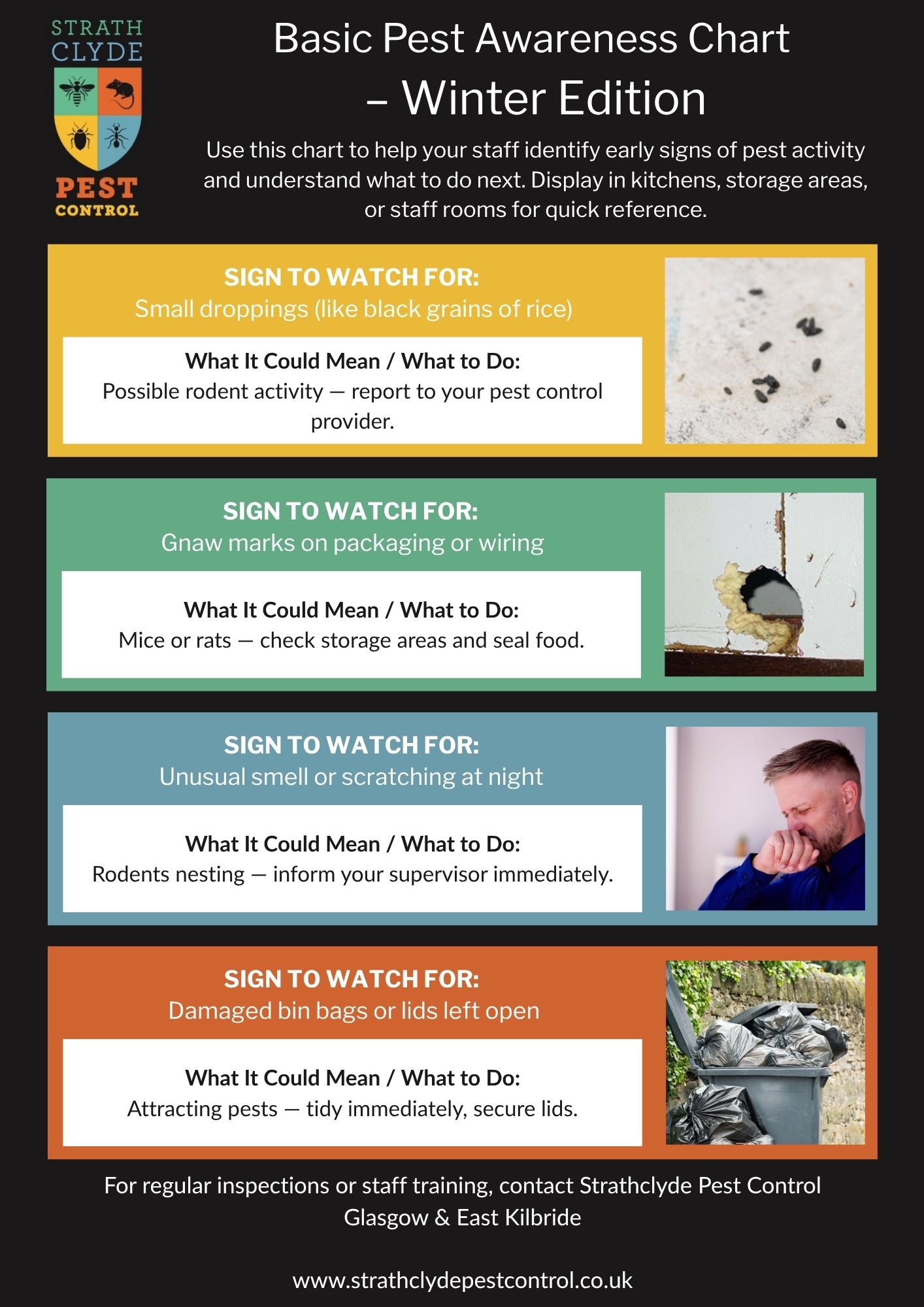 Your team can be your best line of defence. They are often the ones who will first notice a smell, droppings or scratching in the walls. So make sure everyone knows what to look for and who to tell if they spot something that might look like pest activity. A quick winter refresher about the signs can help keep your staff aware and stop small issues from becoming full pest infestations. We’ve made a handy chart for you to use with your staff to explain the basic signs to look out for…